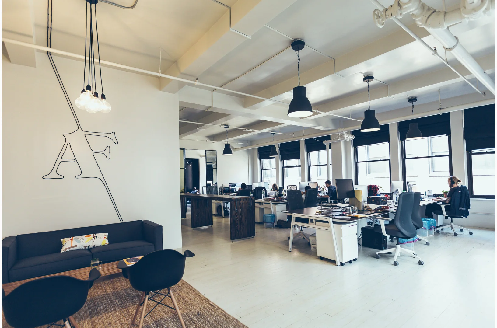 The space was home to a lighting design studio / showroom before we moved in. The space was gloriously open, painted white and black, with gorgeous custom factory doors on two of the 9' doorways. However, it was made for maybe 5 people to exist in at once. It was designed to showcase light fixtures, not facilitate creativity amongst 20 designers and strategists and technologists.
